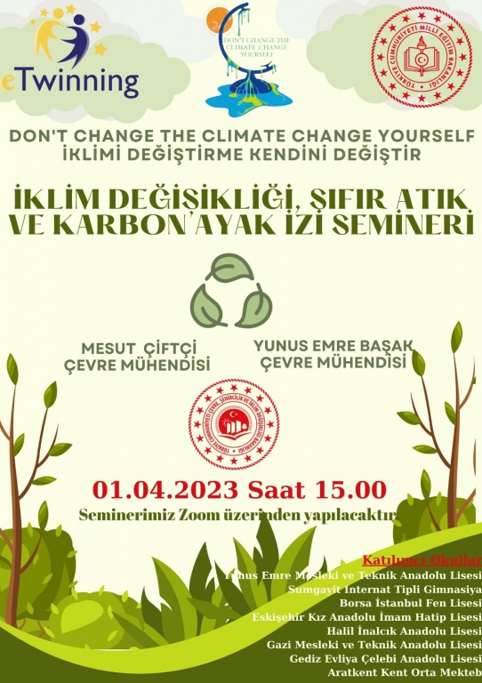 İKLİMİ DEĞİŞTİRME KENDİNİ DEĞİŞTİR (DON'T CHANGE THE CLIMATE CHANGE YOURSELF) e-twinning projemizin öğretmeni MEHMET CEYLAN'a ve ELİF IŞIK, GÜNEY ŞEN, BEGÜM NİSA AKKAYA, İREM AZRA KALKAN, DİDE NAZLIM KARAKAŞ ,EKİN ALP, CEYDA HURİ GÜNDOĞDU öğrencilerimize göstermiş oldukları başarı için teşekkür ederiz.